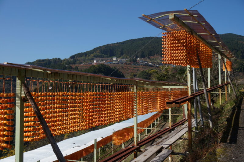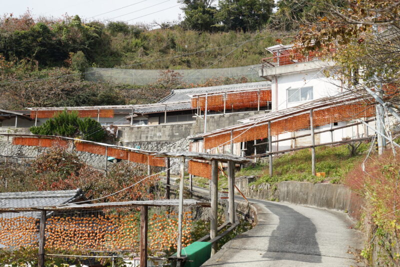 ここは山間の斜面に転々と集落があり、毎年11月になると鏡餅に飾る串柿の生産が始まり、民家の庭先や沿道に多くの串柿が干され、オレンジ色の景色が広がります。